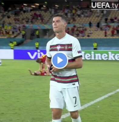 Cristiano Ronaldo deluso dopo l'eliminazione negli ottavi di finale di EURO 2020 del suo Portogallo contro il Belgio di Romelu Lukaku....