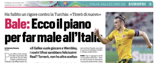 L'edizione odierna del "Corriere dello Sport" riporta le dichiarazioni di Gareth Bale, stella del Galles, a poche ore dalla sfida...