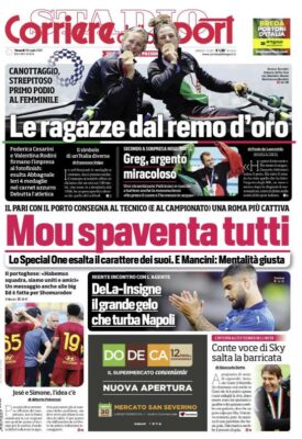 La prima pagina del "Corriere dello Sport" si sofferma sulle Olimpiadi. Canottaggio, strepitoso oro per le azzurre Cesarini e Rodini....