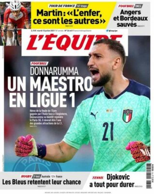 La prima pagina de "L'Equipe" di oggi è dedicata a Gigio Donnarumma. In Francia si celebra l’Italia per la conquista...