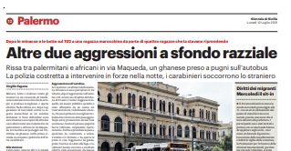L'edizione odierna del "Giornale di Sicilia" si sofferma sulle ultime aggressioni a sfondo razziale avvenute a Palermo. Sabato notte è...