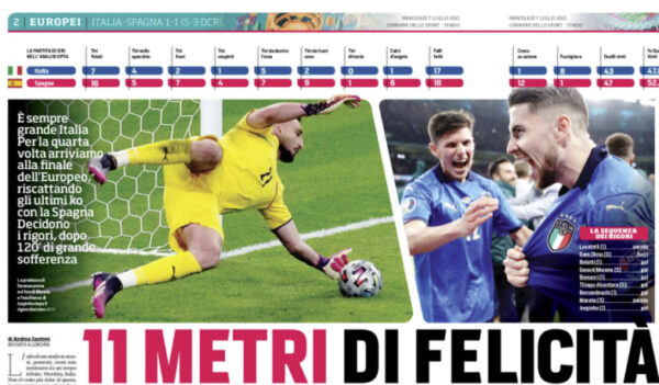La prima pagina del "Corriere dello Sport" si sofferma sull'approdo in finale dell'Italia. Gli azzurri vincono la lotteria dei rigori...