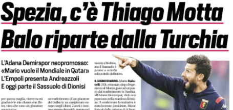 Corriere dello Sport: “Spezia, c’è Thiago Motta. Balo riparte dalla Turchia. Tutte le trattative del giorno in serie A”