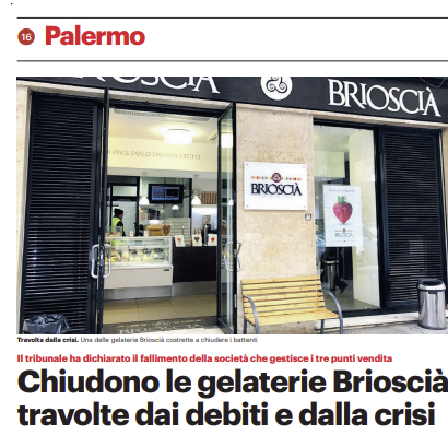 L'edizione odierna del "Giornale di Sicilia" si sofferma sulla chiusura delle gelaterie "Brioscià" a Palermo. Chiusi i due punti vendita...