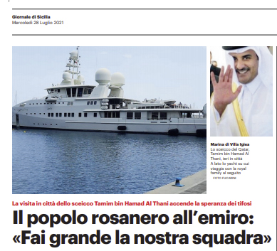 Gds: “La visita in città dello sceicco Tamim bin Hamad Al Thani accende la speranza dei tifosi. Il popolo rosanero all’emiro «Fai grande la nostra squadra»”