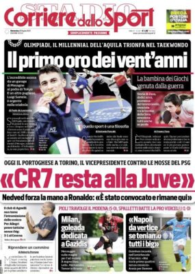 Prima pagina Corriere dello Sport: “Olimpiadi, il primo oro dei vent’anni. «CR7 resta alla Juventus»”