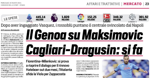 L'edizione odierna del "Corriere dello Sport" fa il punto sul mercato di Serie A. Il Genoa, in difesa, punta al raddoppio....