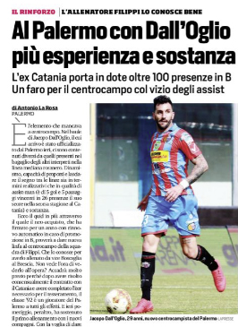 L'edizione odierna del "Corriere dello Sport" si sofferma sul calciomercato del Palermo. Jacopo Dall'Oglio è l'elemento che mancava al centrocampo...