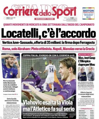 La prima pagina del "Corriere dello Sport" si sofferma su Locatelli. Il centrocampista firmerà con la Juventus dopo Ferragosto. L'Atletico...