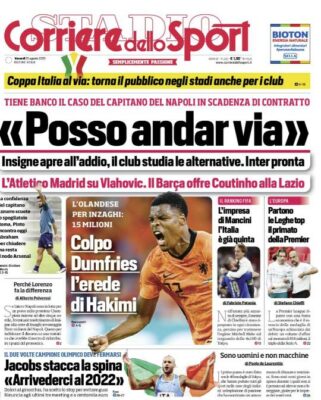 La prima pagina del "Corriere dello Sport" si sofferma sulla Serie A. Insigne apre all'addio al Napoli. Inter, colpo Dumfries.
