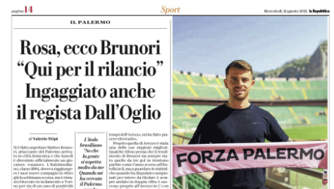 L'edizione odierna de "La Repubblica" riporta le dichiarazioni di Matteo Brunori, nuovo attaccante del Palermo «Appena sono arrivato allo stadio...