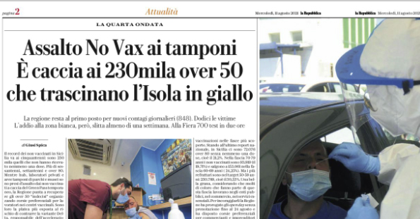 Repubblica: “Assalto No Vax ai tamponi. È caccia ai 230mila over 50 che trascinano l’Isola in giallo”