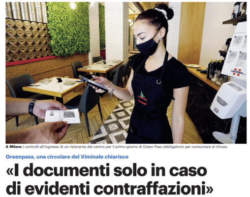 Gds: “Green pass, una circolare del Viminale chiarisce «I documenti solo in caso di evidenti contraffazioni». Gli esercenti potranno chiederli ai clienti”