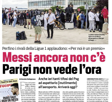 L'edizione odierna de "Il Corriere dello Sport" si sofferma sull'attesa dei tifosi del Psg per l'arrivo di Messi. All’aeroporto di...