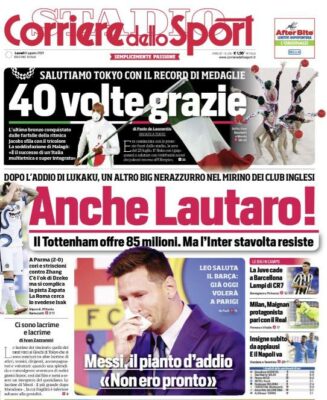 La prima pagina del "Corriere dello Sport" esalta le prestazioni degli atleti azzurri alle Olimpiadi. "40 volte grazie" si legge....