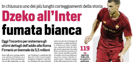 L'edizione odierna del "Corriere dello Sport" si sofferma sul vicino approdo di Edin Dzeko all'Inter. Domani il calciatore potrebbe arrivare...