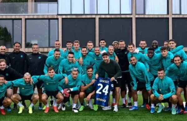 Christian Eriksen riabbraccia i compagni dell'Inter. Grandi sorrisi e la maglia numero "24" al centro della foto di gruppo. Una...