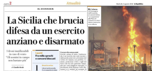 L'edizione odierna de "La Repubblica" si sofferma sull'emergenza incendi in Sicilia. L'antincendio è un esercito dai costi enormi e dalle...