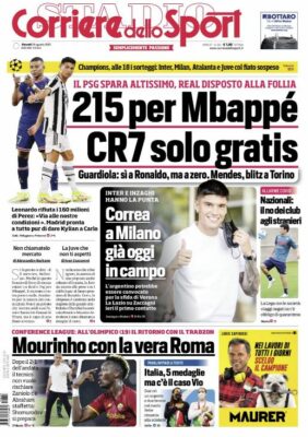 Prima pagina Corriere dello Sport: “215 per Mbappé. CR7 solo gratis”
