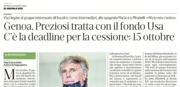 L'edizione odierna de"Il Secolo XIX" parla della possibile cessione del Genoa. Il patron dei grifoni Preziosi tratta con un fondo...