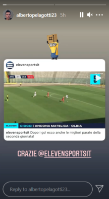 Attraverso le proprie stories Alberto Pelagotti ha ringraziato Eleven Sport per avergli assegnato la palma di miglior parata della seconda...