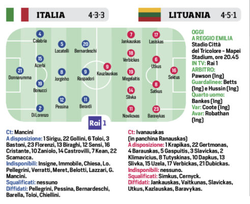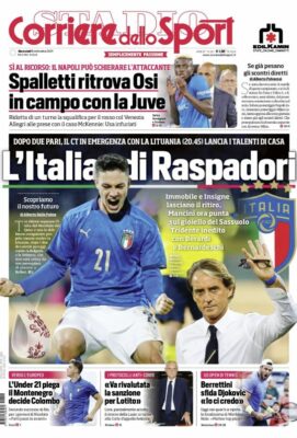 L'edizione odierna de "Il Corriere dello Sport" dedica la prima pagina all'Italia di Mancini che questa sera affronterà la Lituania.