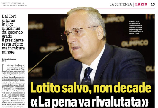 L'edizione odierna de "Il Corriere dello Sport" si sofferma sulla vicenda che riguarda Lotito. Lotito non è decaduto e forse...