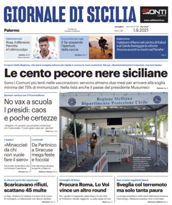 La prima pagina dell'edizione odierna del "Giornale di Sicilia" parla dei Comuni più lenti nelle vaccinazioni: servono almeno due mesi...