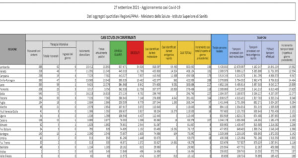 Il bollettino nazionale sui dati Covid diffuso dal Ministero della Salute e dalla Protezione Civile registra per oggi, 27 settembre,...