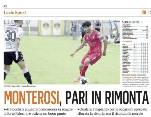 L'edizione odierna de "Il Messaggero" si sofferma sulla gara pareggiata ieri dal Monterosi in rimonta contro il Palermo. Al Rocchi...