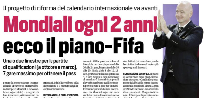 Corriere dello Sport: “Mondiali ogni 2 anni. Ecco il piano Fifa”