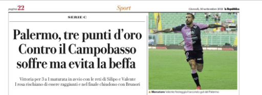 L'edizione odierna de "La Repubblica" si sofferma sulla gara vinta ieri dal Palermo contro il Campobasso. Il Palermo batte il...