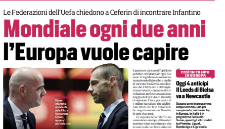 L'edizione odierna de "Il Corriere dello Sport" si sofferma sulla questione relativa al mondiale ogni due anni. Fifa e Uefa...
