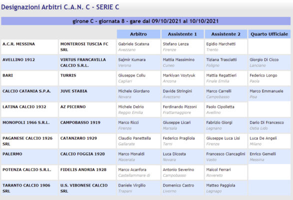Sono state rese note le designazioni arbitrali della 8^ giornata del Girone C di Serie C. Nell'ordine per ogni partita...