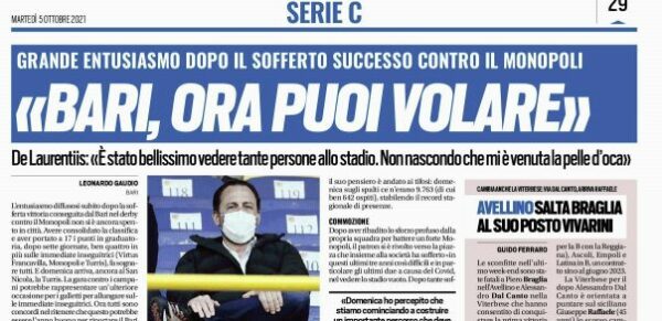 L'edizione odierna di Tuttosport si sofferma sull'entusiasmo in casa Bari. L’entusiasmo diffusosi subito dopo la sofferta vittoria conseguita dal Bari...