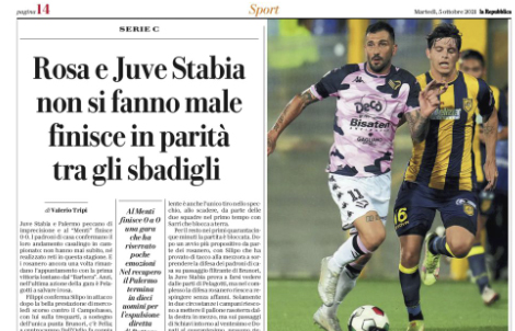L'edizione odierna de "La Repubblica" si sofferma sul pari di ieri tra Juve Stabia e Palermo. Juve Stabia e Palermo...