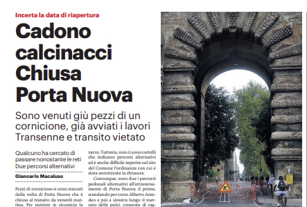 L'edizione odierna de "Il Giornale di Sicilia" si sofferma sulla chiusura di Porta Nuova. Pezzi di cornicione si sono staccati...