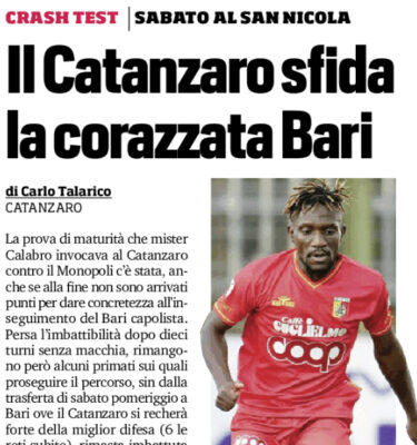 Corriere dello Sport: “Crash test sabato al San Nicola. Il Catanzaro sfida la corazzata Bari”