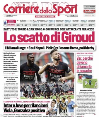 L'edizione odierna de "Il Corriere dello Sport" dedica la prima pagina alla vittoria del Milan di ieri grazie a Giroud.