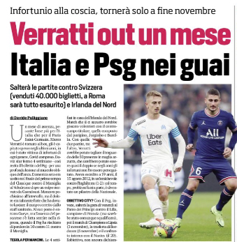 L'edizione odierna de "Il Corriere dello Sport" si sofferma sull'infortunio di Verratti. Un mese di assenza, pesante forse più per...