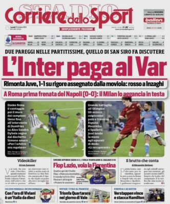 Prima pagina Corriere dello Sport: “L’Inter paga al Var: rimonta Juve, 1-1 su rigore”