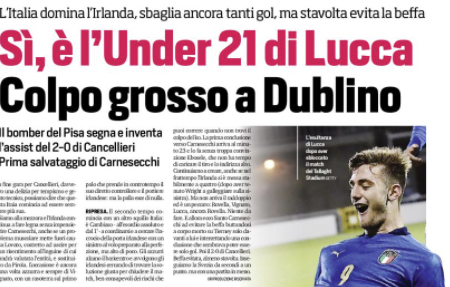L'edizione odierna de "Il Corriere dello Sport" si sofferma sull'Italia Under 21 che ieri ha battuto l'Irlanda trascinata da Lucca....