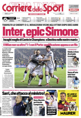 L'edizione odierna de "Il Corriere dello Sport" si sofferma sulla Champions in particolar modo sulla vittoria dell'Inter.