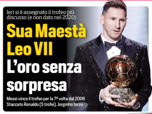 L'edizione odierna de "Il Corriere dello Sport" si sofferma sul pallone d'oro vinto da Messi. Leo Messi ha sempre quell’espressione...