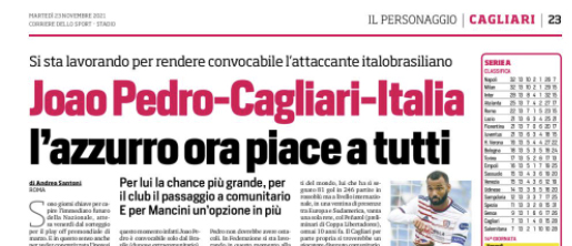 L'edizione odierna de "Il Corriere dello Sport" si sofferma sulla possibilità di Joao Pedro di giocare per l'Italia. Sono giorni...