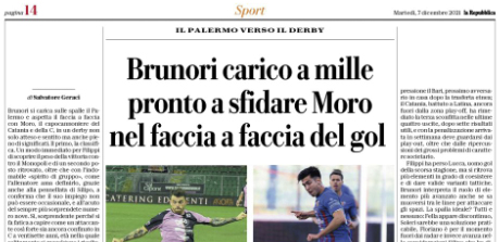 L'edizione odierna de "La Repubblica" si sofferma sul derby tra Catania e Palermo in programma domenica e sul duello a...