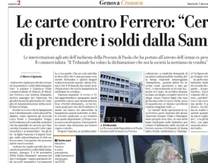 L'edizione odierna de "Il Secolo XIX" riporta un'intercettazione telefonica tra Andria Diamanti e Gianluca Vidal nell'ambito nell'inchiesta che ha portato...