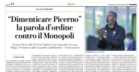 L'edizione odierna de "La Repubblica" si sofferma sulla gara di oggi tra Palermo e Monopoli. Vuole ripartire per un’altra volata...