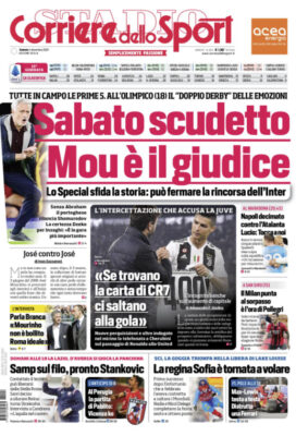Prima pagina Corriere dello Sport: “Sabato scudetto, Mou è il giudice. Lo special sfida la storia: può fermare la rincorsa dell’Inter”