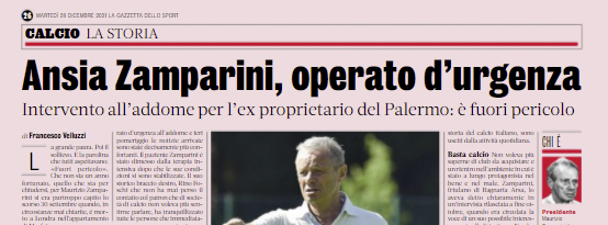 L'edizione odierna de "La Gazzetta dello Sport" si sofferma su Maurizio Zamparini operato d'urgenza a Udine. La grande paura. Poi...